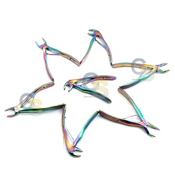 - ITEM: GERMAN GRADE STAINLESS SET OF 7 EACH PEDO DENTAL TOOTH EXTRACTING EXTRACTION FORCEPS SATIN FINISH RAINBOW COLOR