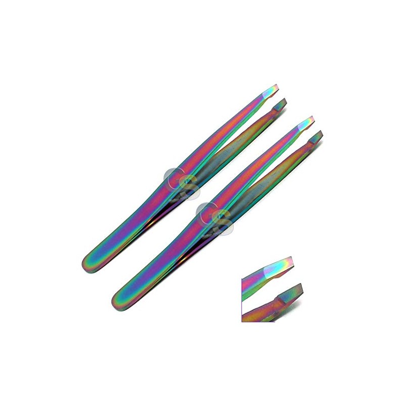 - G.S SET OF 2 MULTI TITANIUM COLOR RAINBOW EYEBROW TWEEZERS SLANT TIP STAINLESS STEEL BEST QUALITY
