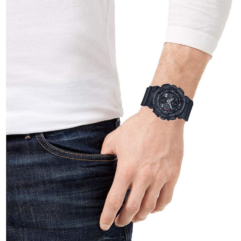 * Make your street style pop with the shock-resistant brilliance of the G-Shock® GA140-1A1 watch. * Adjustable resin band. * Traditional buckle closure. * Combo two-hand analog and negative digital display. * LED light with custom illumination duration (1.5 and 3 seconds). * World time 31 zones (48 cities + coordinated universal time). * Daylight savings on/off. * Timekeeping: • Analog: 2 hands (hour, minute (hand moves every 20 seconds) • 1 dial (mode / stopwatch seconds / countdown timer seconds) • Digital: Hour, minute, second, pm, month, date, day