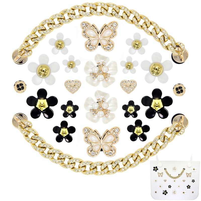 - COMPLETE SET: 22-piece charm collection featuring butterflies, flowers, pearls, and a decorative chain designed for beach tote bag customization