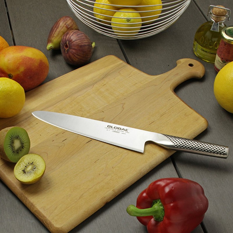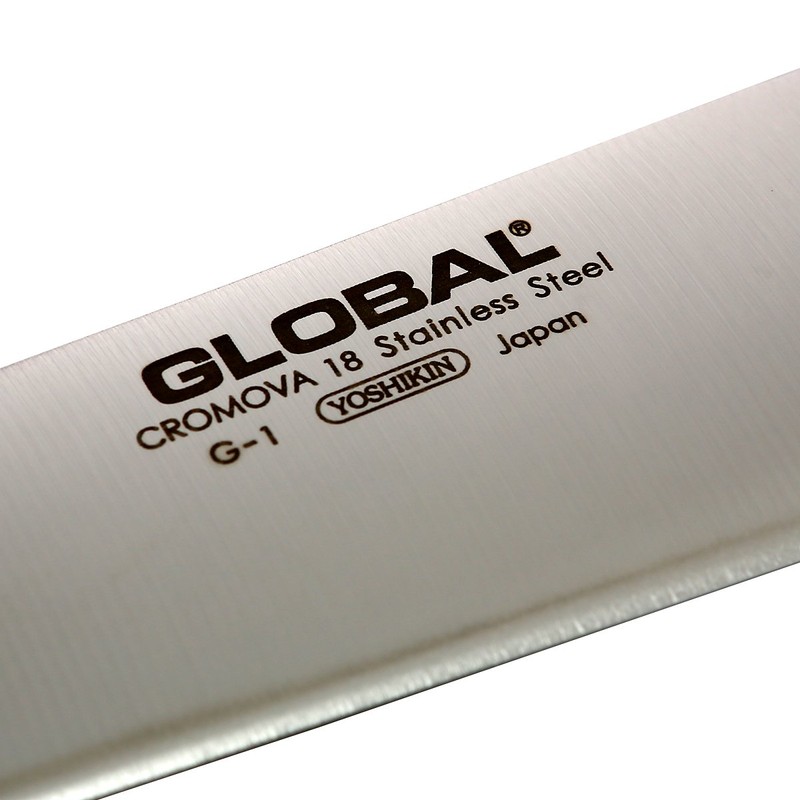 Global G Series Knives - The G Series is a classic collection of large Global knives. The G Series includes the bestselling knife - the G-2 20cm Cooks knife, as well as other 'must-haves' like the Bread knife and 16cm Boning knife. Manufactured by Yoshikin in Niigata, Japan, using exclusive CROMOVA 18 high carbon stainless steel. Superior razor sharp edge ground steeply to a point on an acute angle holding a sharper edge for longer. Precisely balanced hollow sand filled handle. Smooth contours and seamless construction, eliminates food or dirt traps offering the ultimate safety and hygiene