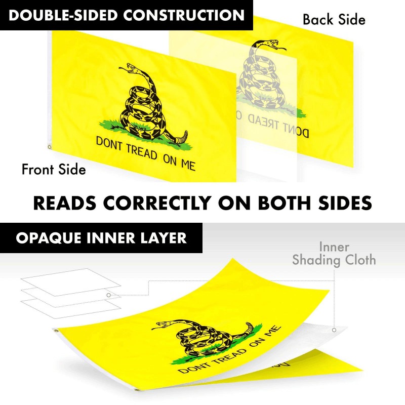 SPECS: 5 ft (60 in) aluminum flag pole, 210D Polyester 2x3 ft double-sided Gadsden flag with brass grommets. This flag displays correctly from either side! Imported, 100% Polyester Flag
