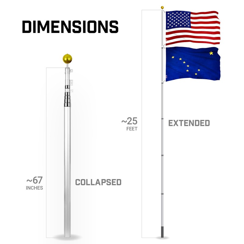 G128 Combo Pack: 25 Ft Telescoping Aluminum Flagpole (Silver) & American and Alaska Flags 3x5 Ft, Both ToughWeave Series Embroidered Polyester | Pole with Flags Included