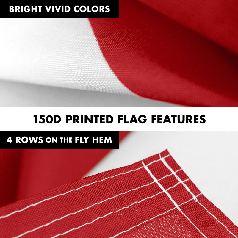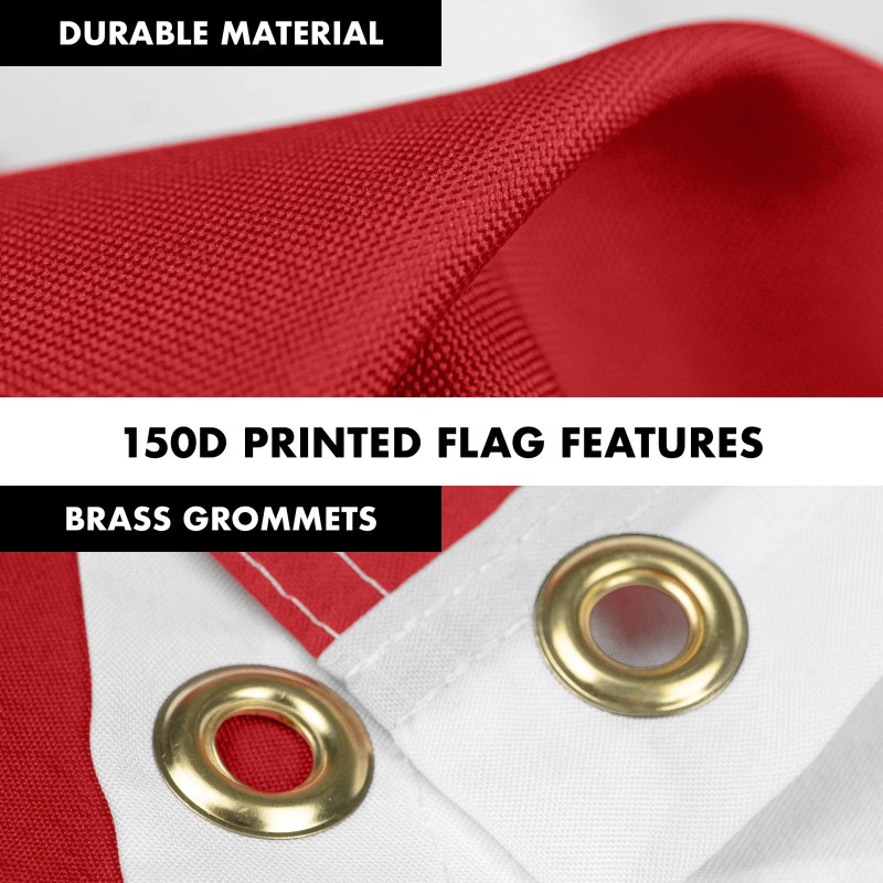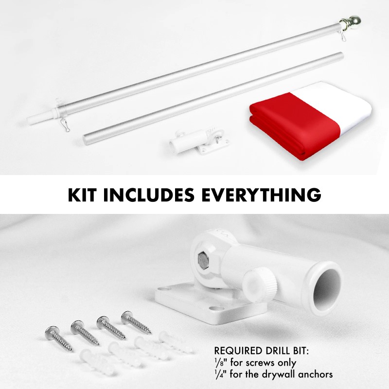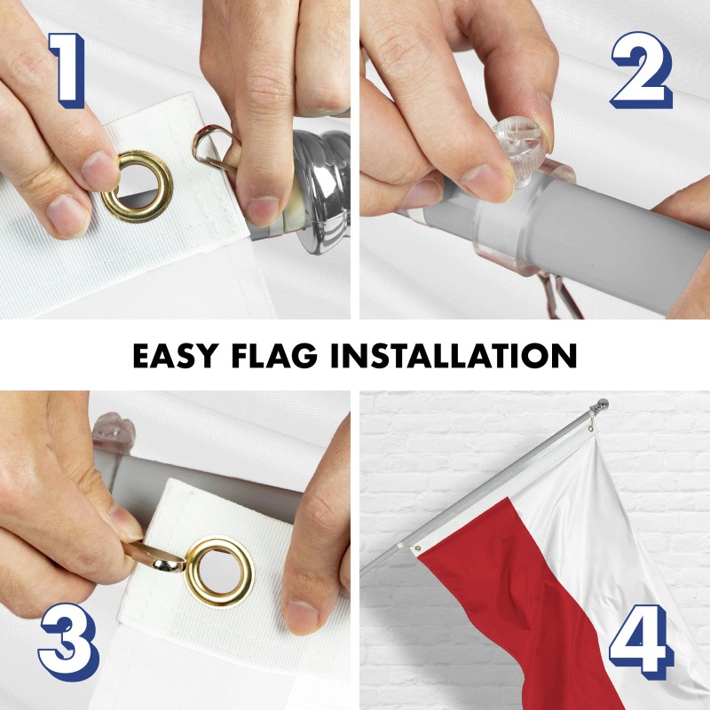 SPECS: 6 ft (72 in) aluminum flag pole, Polyester 3x5 ft Poland printed 150D flag with brass grommets. Imported, 100% Polyester Flag