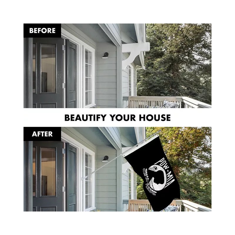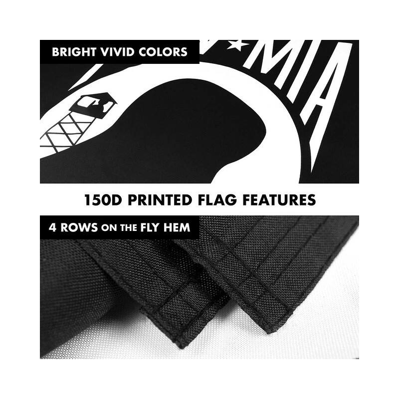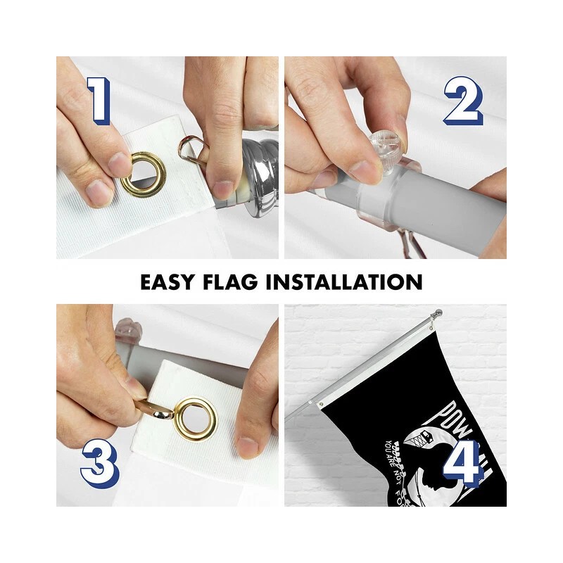 SPECS: 6 ft (72 in) aluminum flag pole, Polyester 3x5 ft POW printed 150D flag with brass grommets. Imported, 100% Polyester Flag