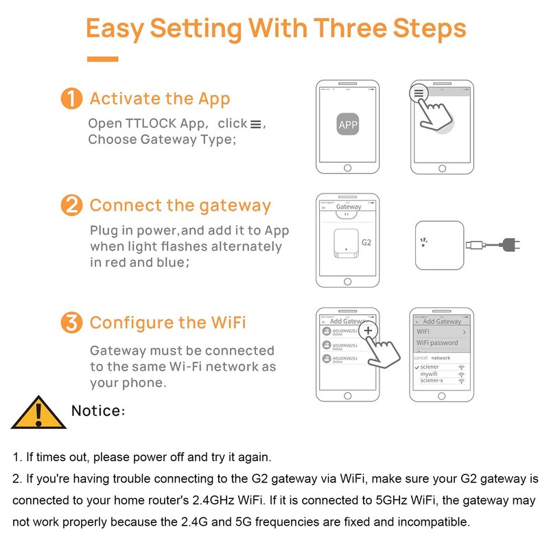 - Amplia cobertura: la distancia estándar entre la puerta de enlace G2 y la cerradura de puerta inteligente es de ≤32 pies. De lo contrario, la conexión de la puerta de enlace Bluetooth se verá afectada. Nuestra puerta de enlace solo funciona con WiFi 2.4G. Al agregar una puerta de enlace, su teléfono inteligente y la puerta de enlace deben estar conectados a la misma red Wi-Fi 2.4G, una puerta de enlace se puede emparejar con múltiples cerraduras electrónicas de puerta, y no hay límite para el número de emparejamiento. Si la conexión se agota, apaga la puerta de enlace y vuelve a conectarla.