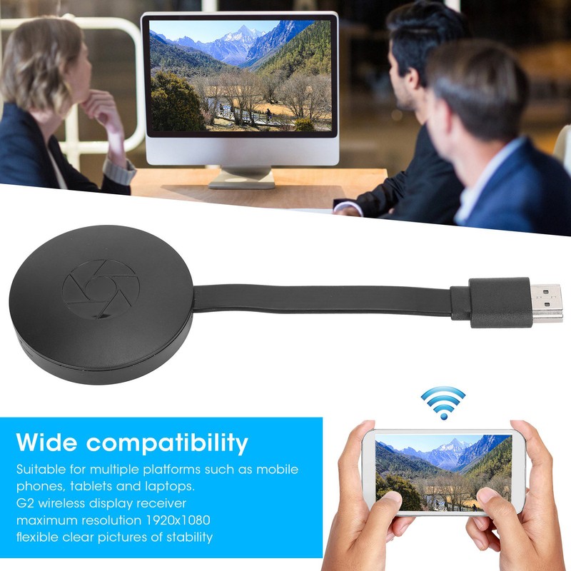 1、G2 wireless display receiver, maximum resolution 1920x1080, flexible clear pictures of stability. 2、Lightweight design, the cute round size for easy carrying, plug and play, no driver required. 3、Projected onto large screen and kept away from screen, wireless streaming media will be helpful in relieving eyestrain. 4、Adopt 8188FTV WiFi module/version, support AVI, DIVX, MKV, DAT, VOB, MPG, MPEG and other video formats. 5、Wide compatibility, suitable for multiple platforms such as mobile phones, tablets and laptops.