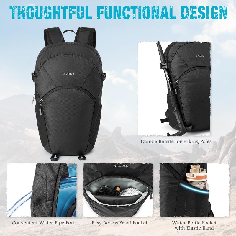 - CONVENIENT WATER PIPE PORT: You can fix your hydration bladder inside the backpack, with the tube extending out through a port for easy sipping. Thoughtful features like double buckles for hiking poles and water bottle pockets with elastic bands make your outdoor or hiking trips feel more at ease