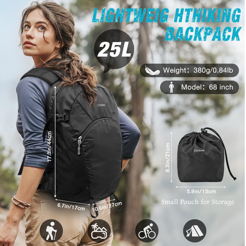G4Free Hiking Backpack with Thickened Back Panel Packable 25L Lightweight Foldable Travel Daypack for Men Women