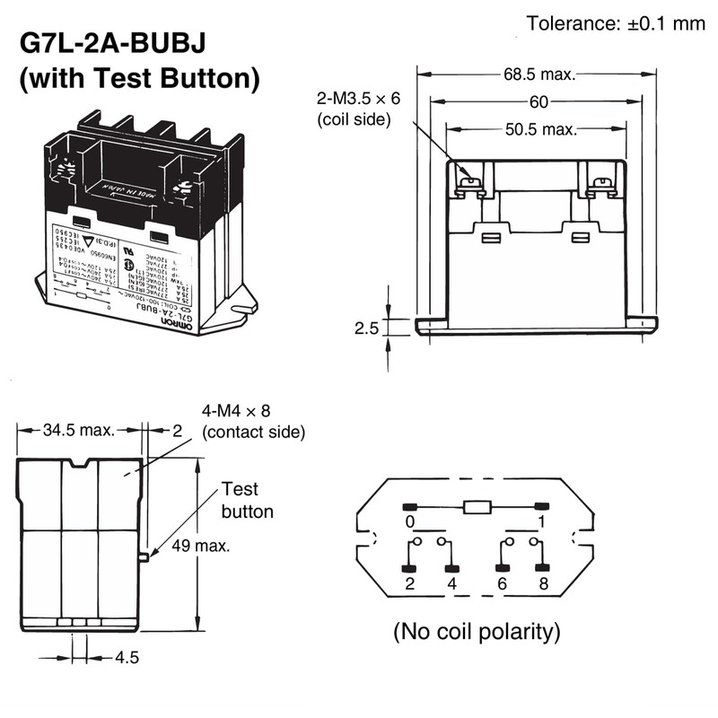 G7L-2A-BUBJ-CB DC24 General Purpose Relay with Test Button - 24 VDC Class B Insulation, Screw Terminal, Upper Bracket Mounting, DPST-NO Contacts