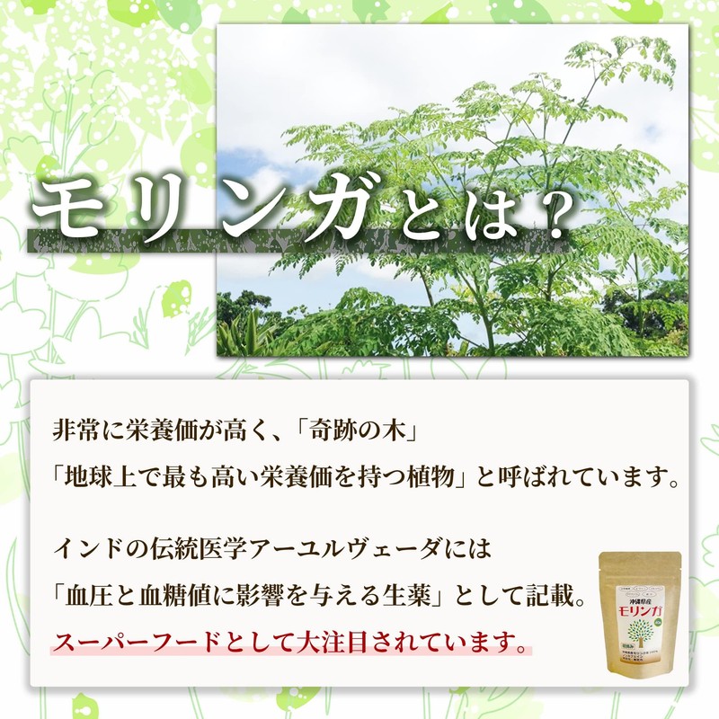 - 食物繊維やポリフェノールが豊富でスーパーフードとしても大注目のモリンガ。無農薬のモリンガを無添加でサプリメントにしました。