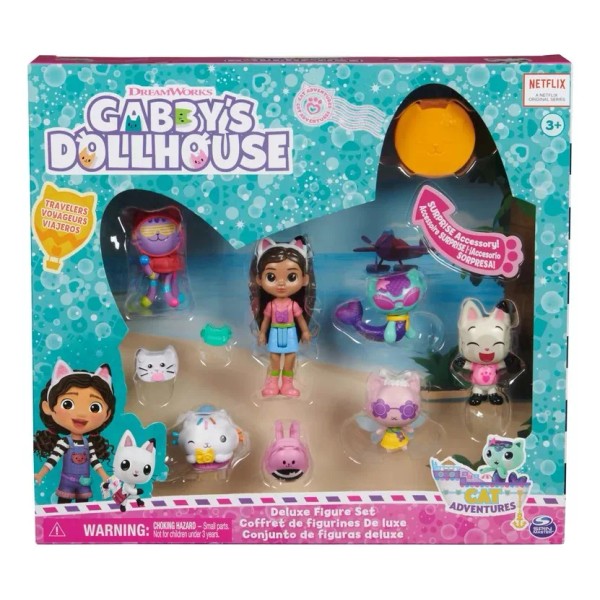 ¡Llévate a casa a tus personajes favoritos de Gabby's Dollhouse, en el exclusivo Traveler Figure Set! Este set de regalo es imprescindible para los fanáticos de Gabby's Dollhouse y viene con 6 figuras de juguete coleccionables, un montón de accesorios de viaje, como una cámara para gatitos, una mochila y mucho más, junto con Dollhouse Delivery, ¡con un accesorio sorpresa adentro! ¡Agregue instantáneamente una muñeca Gabby exclusiva a su colección, junto con los amigos gatitos fantásticos de Gabby, Cakey Cat, DJ Catnip, Mercat, Pandy Paws y Kitty Fairy! ¡Cada figura presenta detalles auténticos que dan vida a estos fantásticos personajes! Luego, tal como lo hace Gabby al comienzo de cada episodio, desempaque su Dollhouse Delivery especial y descubra el juguete sorpresa. ¿Qué encontrarás dentro? Después de la revelación, usa tu imaginación para vivir tus propias aventuras en la casa de muñecas con Gabby y sus gatos. Además, para aún más formas de jugar, agrega tus figuras a Gabby's Purrfect Dollhouse y Gabby's Friend Ship (cada uno se vende por separado). Para una última sorpresa, escanee el código QR dentro de Dollhouse Delivery para desbloquear una recompensa especial en la aplicación gratuita Gabby's Dollhouse (disponible en iOS y Android). Para obtener aún más formas de jugar, busque Gabby Cat Friend Ship, Gabby's Purrfect Dollhouse y Dollhouse Rooms temáticas, para construir su mundo de casa de muñecas aún más (¡Cada uno se vende por separado)! Los animales de peluche, las muñecas, las figuras de juguete y los juegos de Gabby's Dollhouse son los juguetes perfectos para niñas y niños a los que les encanta usar su imaginación para crear su propio mundo de casas de muñecas, ¡así que prepárate para infinitas aventuras de juego imaginario con el paquete de figuras de viajero de Gabby's Dollhouse!