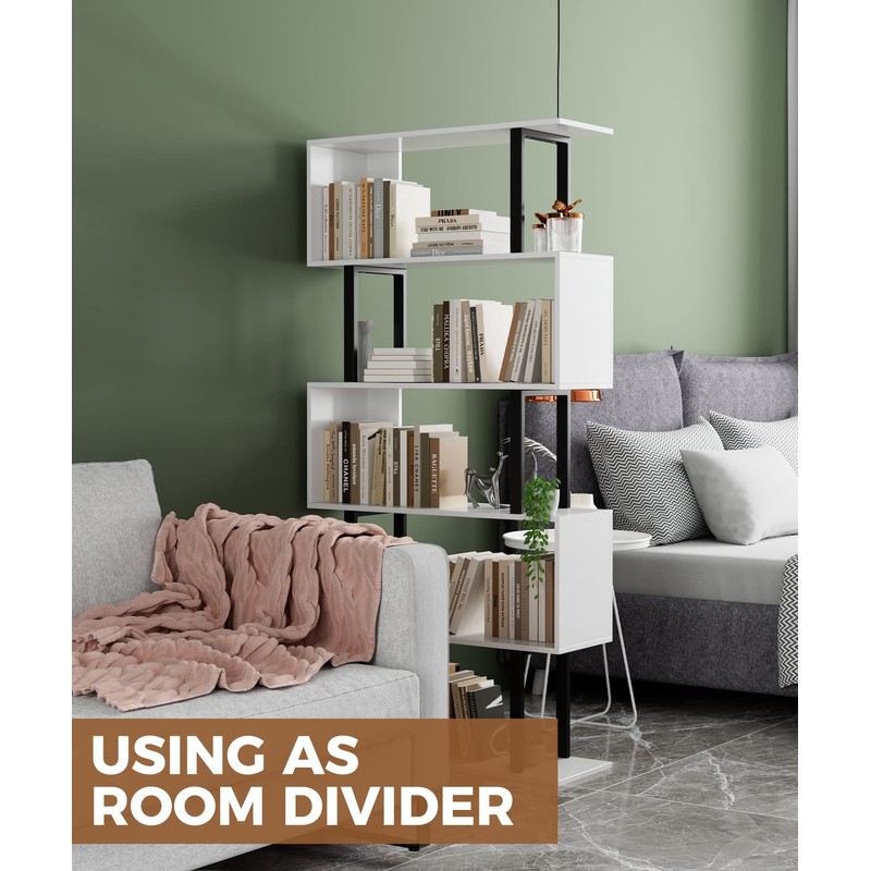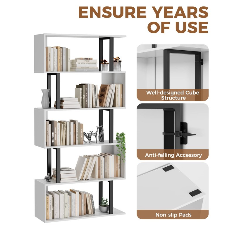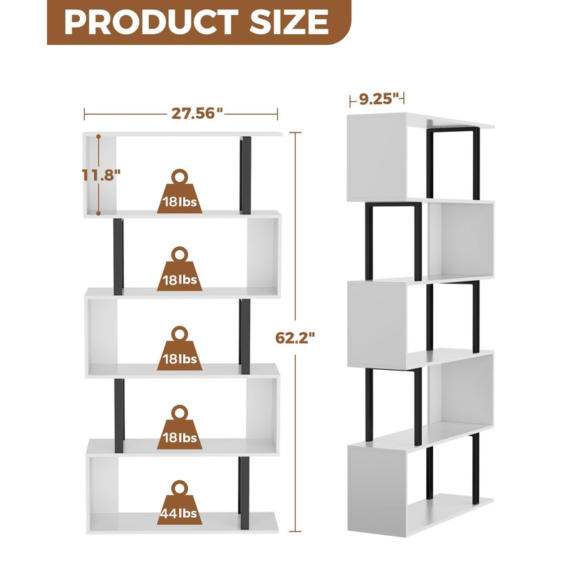 Gadroad Gadroad 5 Tier Geometric Bookcase,S Shaped Bookshelf, Wood Decorative Storage Shelving, Modern Freestanding Display Shelves, Tall Book Shelf Unit for Living Room Bedroom, White