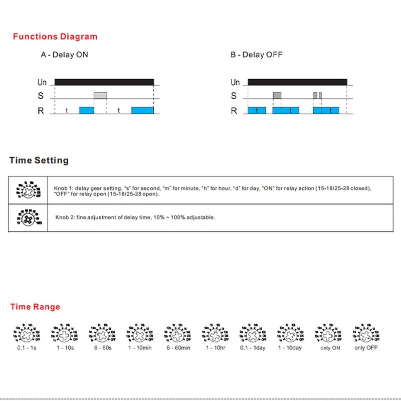 - Function Mode:It has two optional modes,A Delay ON or B Delay OFF.