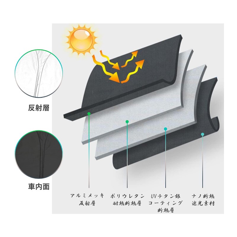 - (Materials/Construction) High-density aluminum plating reflective layer, polyurethane heat resistant insulation layer, UV titanium silver coating insulation layer, nano thermal insulation material Adopting 4 layers, 4 different materials cooperate to build a reflective layer of sunshade and insulation layer, to block the intense light of the summer sun, reducing the temperature of the car. It can effectively reduce the intrusion of ultraviolet rays by more than 99% and protect your health. Made of high quality high-density nylon cloth, lightweight and durable