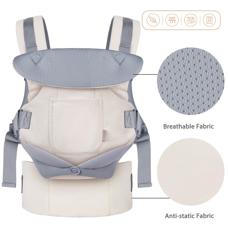 - ADJUSTABILITY Adjustable width of baby's hips for different positions, padded shoulder straps and supportive waist belt, designed to fit a variety of body types and lifestyle.