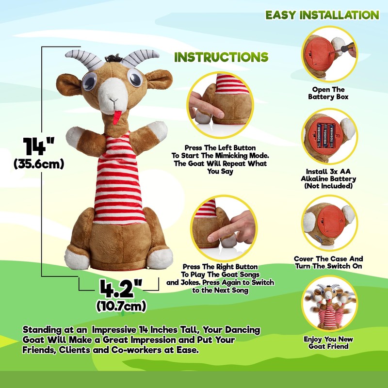 - UNFORGETTABLE PERFORMANCES: This hilarious repeating toy, a plush figure, doesn't just excel at mimicry; it's also a singing sensation! With impressive sound quality, it belts out random tunes that are a true treat for the ears. Whether it's jazz scat, yodel, or just plain silliness, this plush goat's performances are sure to entertain and amuse.