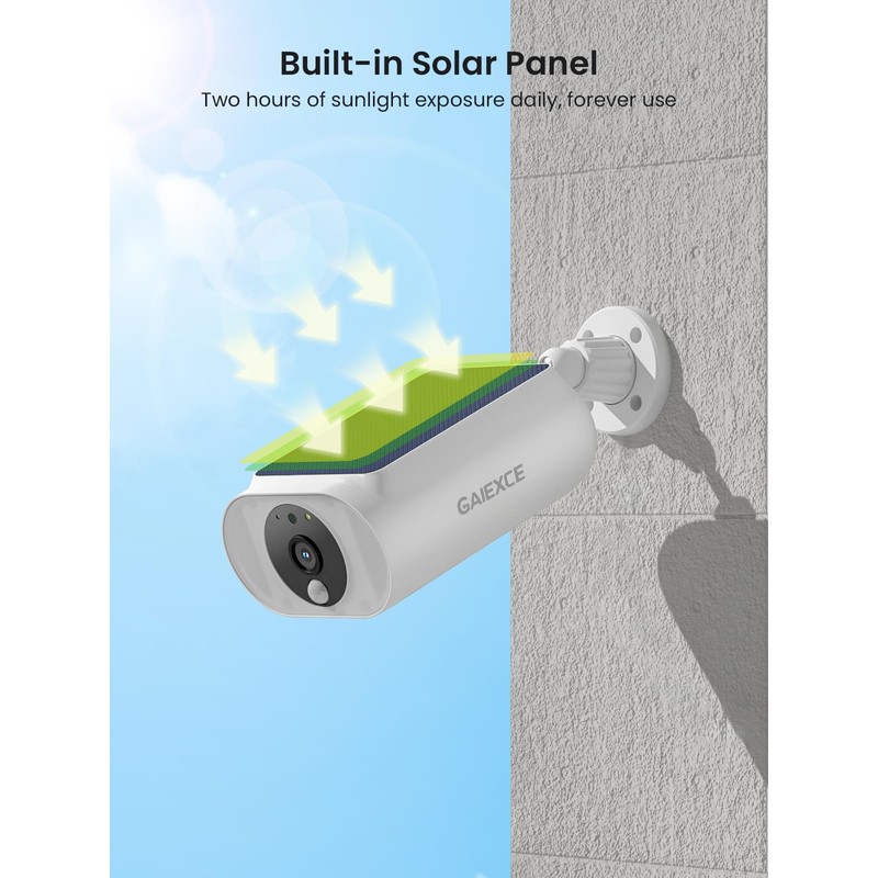 GAIEXCE Solar Security Camera, Wireless Security Camera Outdoor, 2K with Integrated Solar Panel, Night Vision, Continuous Power, 2.4/5 GHz Wi-Fi, for Surveillance, Compatible with Alexa