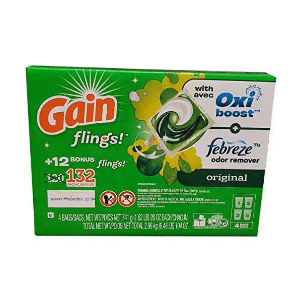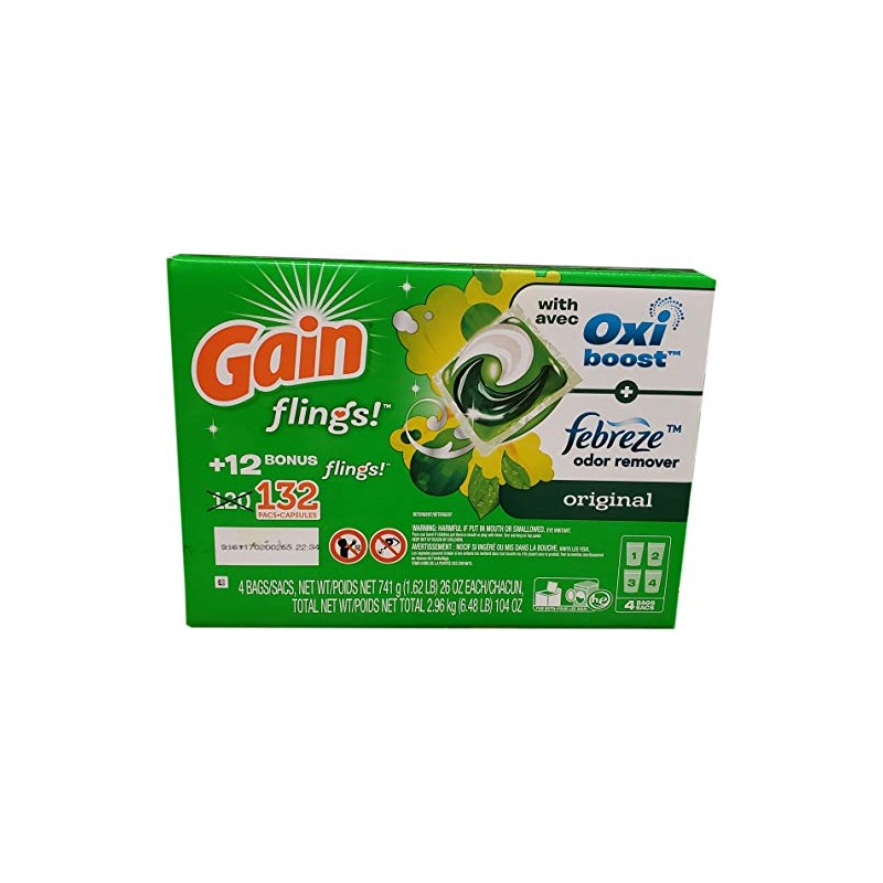 About this item GAIN Original Scent stain-fighting power of Oxi Odor- Elimination of technology of Febreze 50% more scent Description easy to use, GAIN flings unit-dose laundry detergent brings 50% more original scent to your laundry room and your clothes. Oxi boost fights stains while odors are removed with the Odor-Elimination technology of Febreze, so your clothes are left wonderfully clean with an amazing scent. With bursts of citrus, a green twist, and just enough floral fragrance, you'll wish laundry day came more often. Specifications GAIN Original Scent stain-fighting power of Oxi Odor- Elimination technology of Febreze 50% more scent Just as easy as tide pods no mess, no hassle long lasting scent