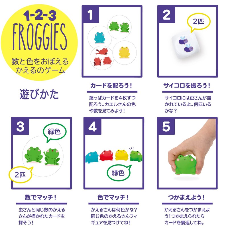 - Set Includes: 48 leaves cards, 4 frog figures, large dice, instruction manual (English language not guaranteed)