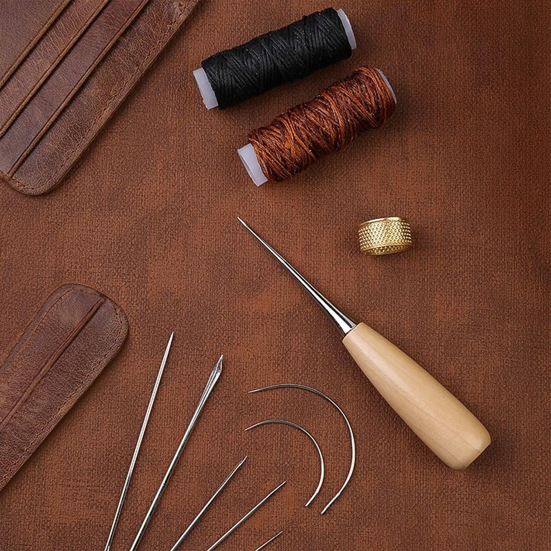 - 【Leather Sewing Kit】The leather sewing kit contains 1 practical perforation awl, 7 leather needles with different functions, 1 roll of black wax thread, 1 roll of brown wax thread, and 1 thimbles for sewing, which are fully functional.