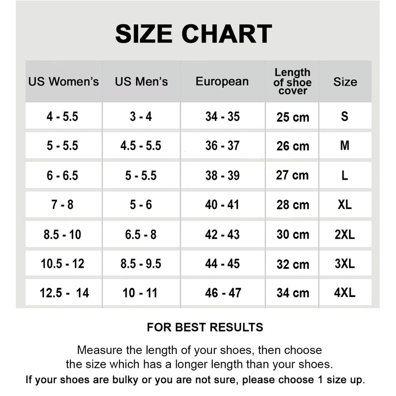 - SIZE - 2 Extra Large - fits a shoe size 42-43 (US men's 6.5-8 - US women's 8.5-10). Length of shoe cover is: 30 cm. To know the size you need, measure the length of your shoe, then choose the shoe cover size that is of greater length than your shoe