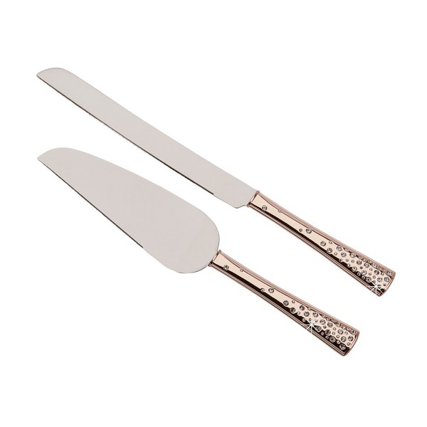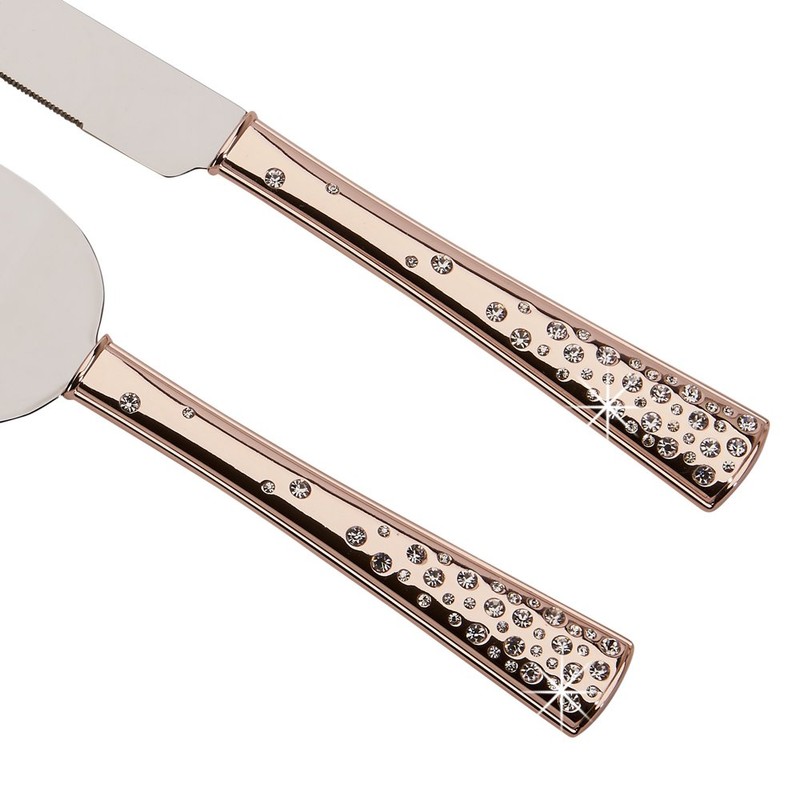 This Galaxy 2 piece Cake Knife and Server Set may just be out of this world. The handles are finished in glistening rose gold and feature an array of embedded crystals twinkling like stars in the galaxy. The 13 long cake knife and the 11 long cake server/lifter feature stainless steel blades. All finishes are non-tarnishing. The set is presented on a white satin lining inside a silver colored lidded gift box.