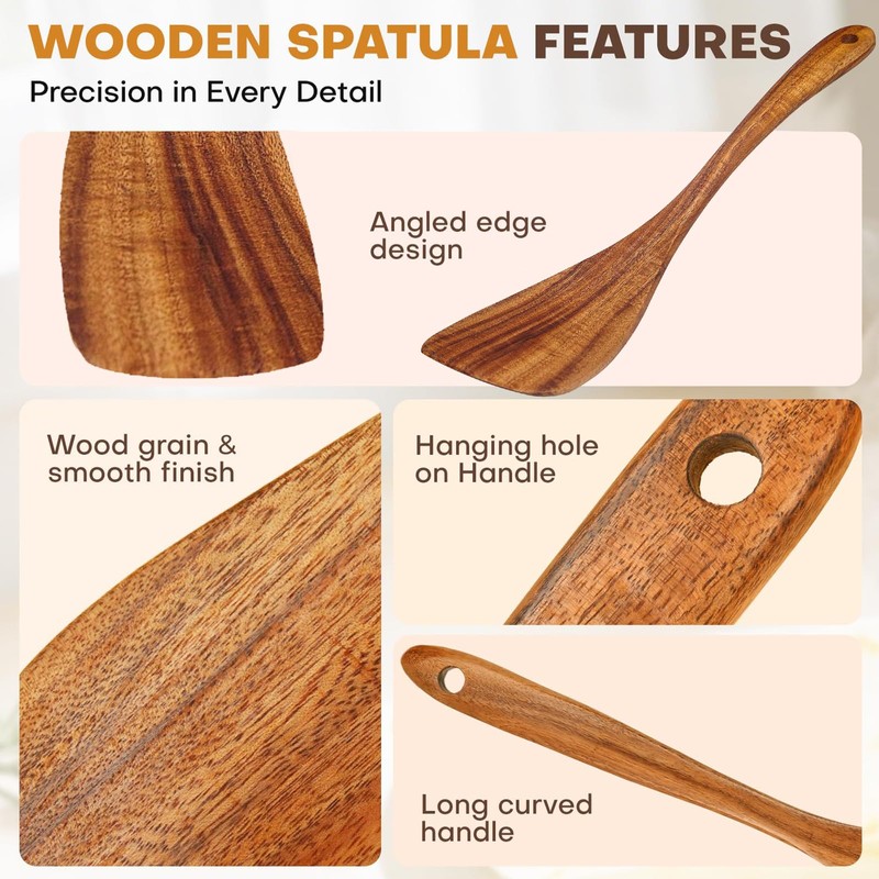 • Unique: Our wooden spatula is hand-polished from a whole piece of natural, small-leaved acacia wood. As the natural wood texture is unique, each piece may vary slightly from the picture. The unique texture of the wooden cooking spoon is complemented by a gentle line design that not only preserves the natural texture, but also adds a rustic touch to your kitchen.
