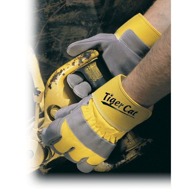 Tiger Cat Work Gloves are sewn from heavy side split leather, the best wearing portion of the hide. Bright yellow backs keep your hands visible to help prevent injuries. Safety cuff allows easy on and off.