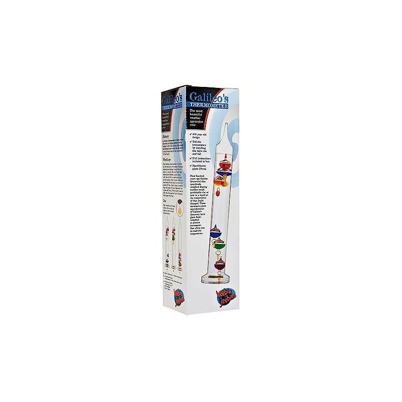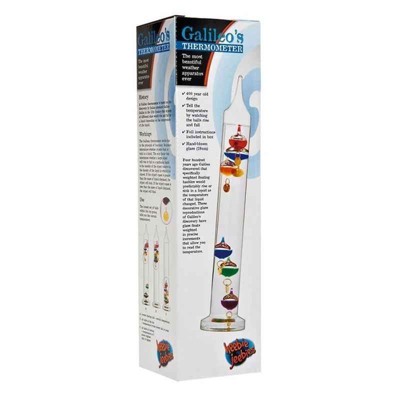 There are 4 sizes of Galileo Thermometer available. This one is 28cm tall with 6 glass balls (temperature range 18oC to 28oC). This is the perfect gift for mum, dad, or any nerdy adult as it is a beautiful piece to put on display.