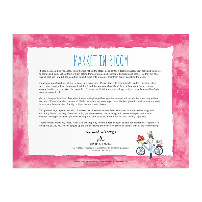 - 2,000-PIECE PUZZLE – The Michael Storrings Marketing in Bloom 2000 Piece Puzzle from Galison is a challenging jigsaw puzzle providing many enjoyable hours of activity. Includes an insert with information about the artist and full puzzle image for reference.