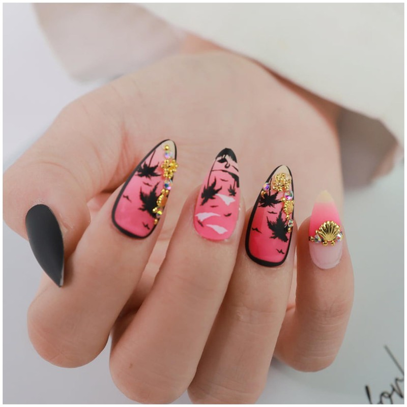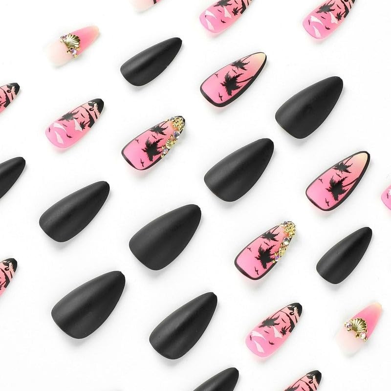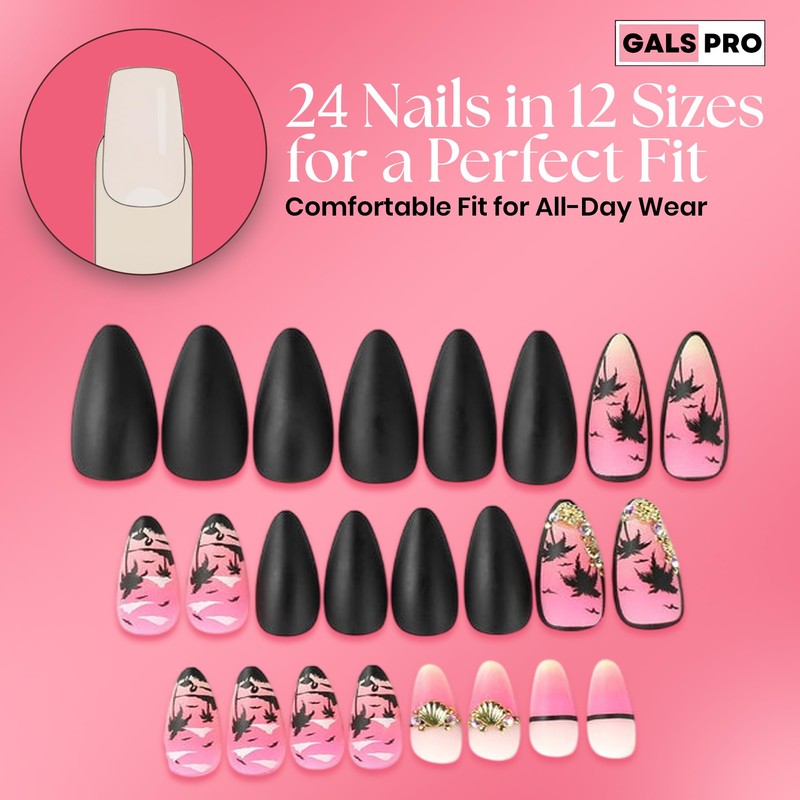 GALSPRO Medium Press on Nails - Set of 24 Fake Nails with Designs in 12 Different Sizes for Perfect Fit, Cute False Nails Kit for Women with 0.07oz Nail Glue (SUNSET PALMS ALMOND SHAPE, Medium)