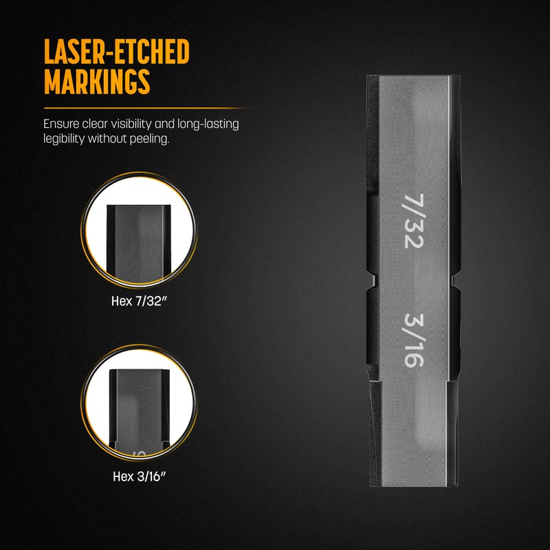 • 2-Sided Bit: Features a Hex 7/32" head on one end and Hex 3/16" head on the other end. Each bit is clearly labeled with easy-to-read laser etching that won't fade.
