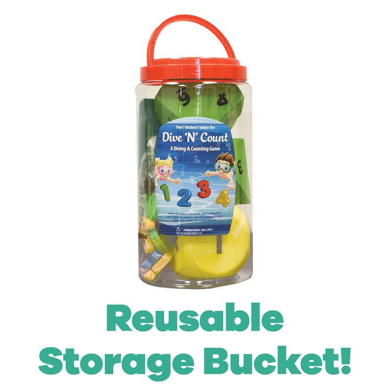 - REUSABLE STORAGE BUCKET For extra convenience, Dive 'N' Count comes in a reusable and durable storage bucket making it easy to store the numbers and dice when not in use. Also makes a great summer birthday gift for kids.