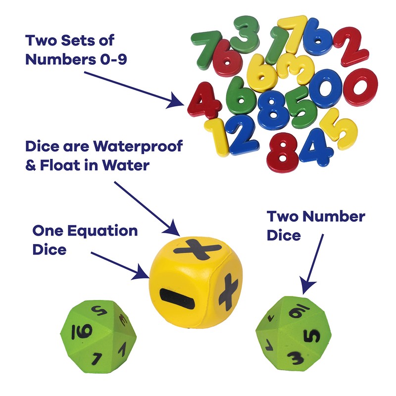 - HOW TO PLAY: Throw all of the numbers in to the pool, they are weighted and will sink to the bottom. Roll the dice for a math problem to solve and time yourself or race against friends to collect all of the numbers needed to answer the math problem on the dice. Create your own game or even try it in the yard for additional ways to play!