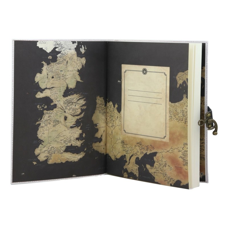 • It contains blank pages made of sustainable thick acid free forest paper. Each journal contains about 240 blank pages. The inside covers (back and front) of the journal features the Map of Westeros. Adding to the high-quality finish, this journal can be sealed shut, using the bronzed clasp locking mechanism on the right-hand side. The clasp lock does not have a key locking feature but it will keep the journal closed shut.