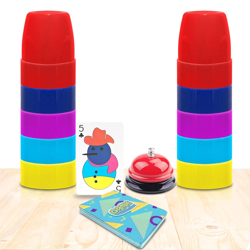 • GET YOUR STACK ON: Introduce some excitement to your downtime with this thrilling take on the classic stacking cup game. The Gamie stack cups kit includes 20 colored cups, 54 challenges, 1 bell, and an instructions guide. The fastest one to match the card with their cups wins.