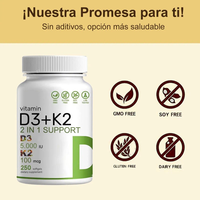 La Vitamina D3 es crucial para la absorción y regulación del calcio en el cuerpo, lo que contribuye a mantener los huesos densos y resistentes, reduciendo el riesgo de fracturas. Además, ayuda a fortalecer el sistema inmunológico, mejorando la capacidad del cuerpo para combatir infecciones y enfermedades. Por su parte, la Vitamina K2 juega un papel fundamental en la distribución adecuada del calcio: dirige este mineral hacia los huesos y dientes, donde es necesario, y previene su acumulación en las arterias, protegiendo la salud cardiovascular y reduciendo el riesgo de problemas circulatorios.