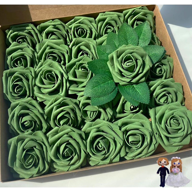 - [ 25pcs flower& 12 leaves ] : Size and Packaging: Each package includes 25Pcs faux green roses. Each green artificial roses’ head is approx 3 inches, the stem is about 7.5 inches long. Considering that not every green fake roses in the bouquet requires leaves, we provide 12 free rose leaves for every 25 green roses. The leaves are not attached, so you can freely place them on the emerald green roses artificial flowers.