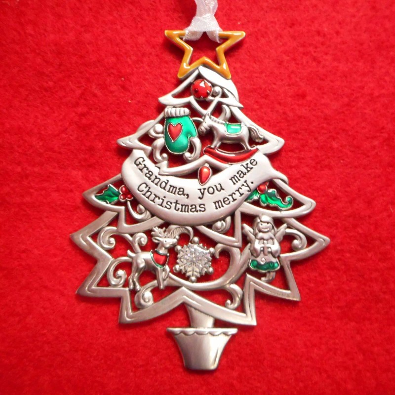 This NEW, delightful ornament, "Grandma, you make Christmas merry", will bring joy to anyone receiving it. The pewter front side is colored with the familiar red and green colors of the Christmas season; although the image is printed on the reverse side, it is only in the silver of pewter.