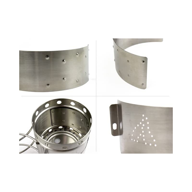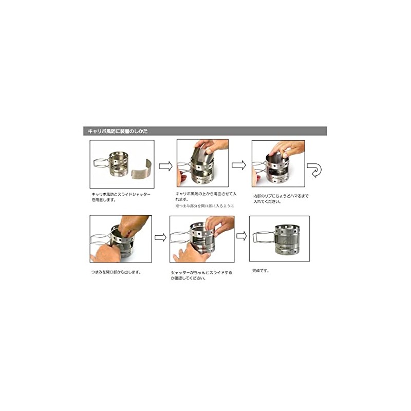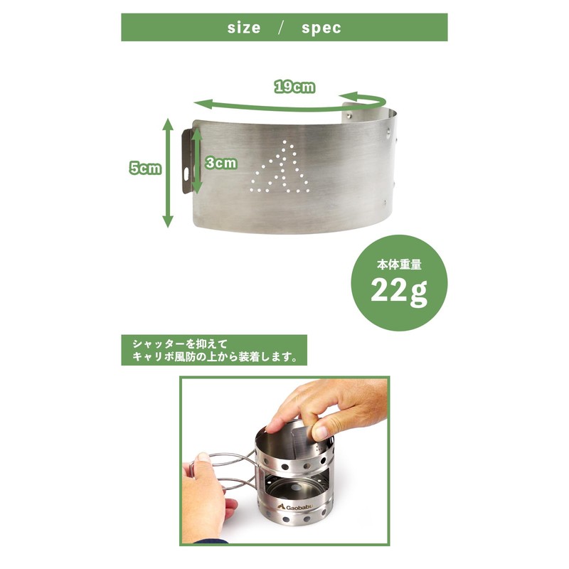 (Improved Point) 10 dents have been added to reduce the resistance of the caliber body by tightening the curvature so that the sliding operation is lighter and the slide. It also has a hole in the knob for attaching chains or clips. Optional parts for Gaobabu caliber windshield. It can be attached to the caliber windshield, so it is recommended for those who are already waiting for a caliber windshield. Gaobabu logo dotted at side The sliding shutters allow the side opening to be manually opened and closed to prevent the firepower from decreasing in strong winds. It also increases the chimney effect, so it also improves combustion efficiency. The sliding function allows you to slide the plate into the extinguishing lid when you want to extinguish while burning. When opening and closing while combusting, the knob portion of the plate becomes very hot, so please use gloves or tongs or pliers. ■ Shutter Body Size (H x L x W): Approx. 2.4 x 5.1 inches (60 x 130 mm) (curved) ■ Weight: Approx. 0.8 oz (22 g) ■ Material: Stainless steel (thickness 0.3 mm)
