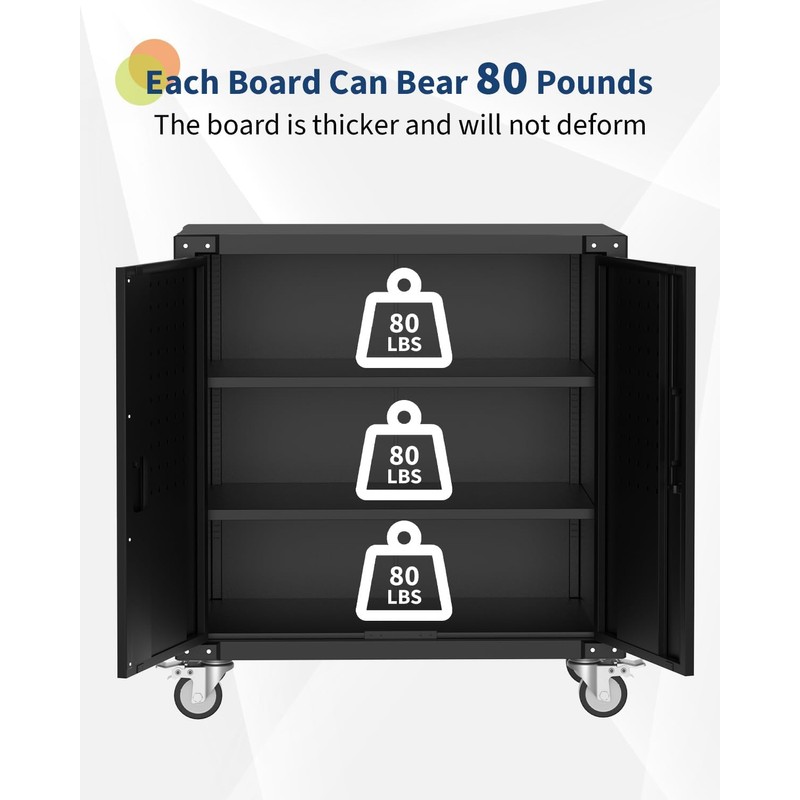 - Adjustable Storage for Maximum Versatility: Customize your tool storage cabinet with two removable shelves, perfect for organizing tool cabinets on wheels. Store power tools, bins, or supplies with ease, and reconfigure the layout anytime to suit your needs.