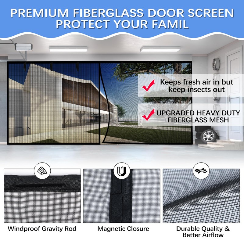 - Our garage door curtains offer excellent resistance to wind and corrosion. It is made of durable fiberglass material to ensure durability for long term use. With 40 powerful magnets, it ensures that your screen door automatically closes smoothly and tightly. Additionally, Extra 16 gravity rods are added at the bottom, which helps to enhance wind resistance. This powerful magnetic and super gravity bar closure allows both people and pets to easily pass through the screen door.