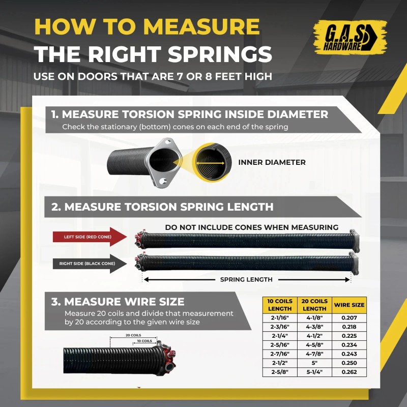 Description: Garage door torsion spring. Left and right hand wound replacement for both sides of garage doors. (Pair)Material: Fabricated with high carbon ASTM 229 Class II Oil-Tempered Wire.Measures: 0.207 in. Wire x 1.75 in. D x 25 in. L. Coil Direction and Side: Left and Right Hand Wound for both sides.Category: Garage Door Torsion Springs > Garage Door Hardware. Recommendation: Replacement spring(s) must match broken spring(s) measurements. Simple installation, just install new or replace old, rusty springs quickly (professional installation recommended)- PREMIUM MATERIAL: Constructed from high-grade ASTM 229 Class II Carbon Steel, our Torsion Springs offer exceptional strength and longevity.