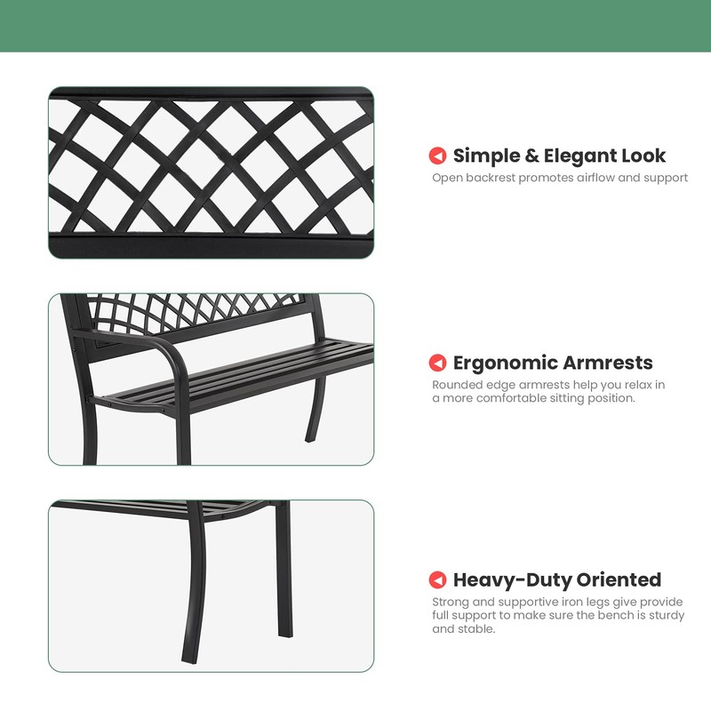- 🌞【Excellent Design & Perfect Size】The lively and exquisite grid embellishments of the Garden Bench are distributed on backrest fashionable plastic backrest and make whole Metal Bench look beautiful. Not only does the Yard Bench offer comfortable sitting experience but also serve as a good decorative ornament. And the garden bench size perfect for two adults.Garden Bench Patio Bench Yard Bench Park Bench Metal Bench outdoor benches clearance.