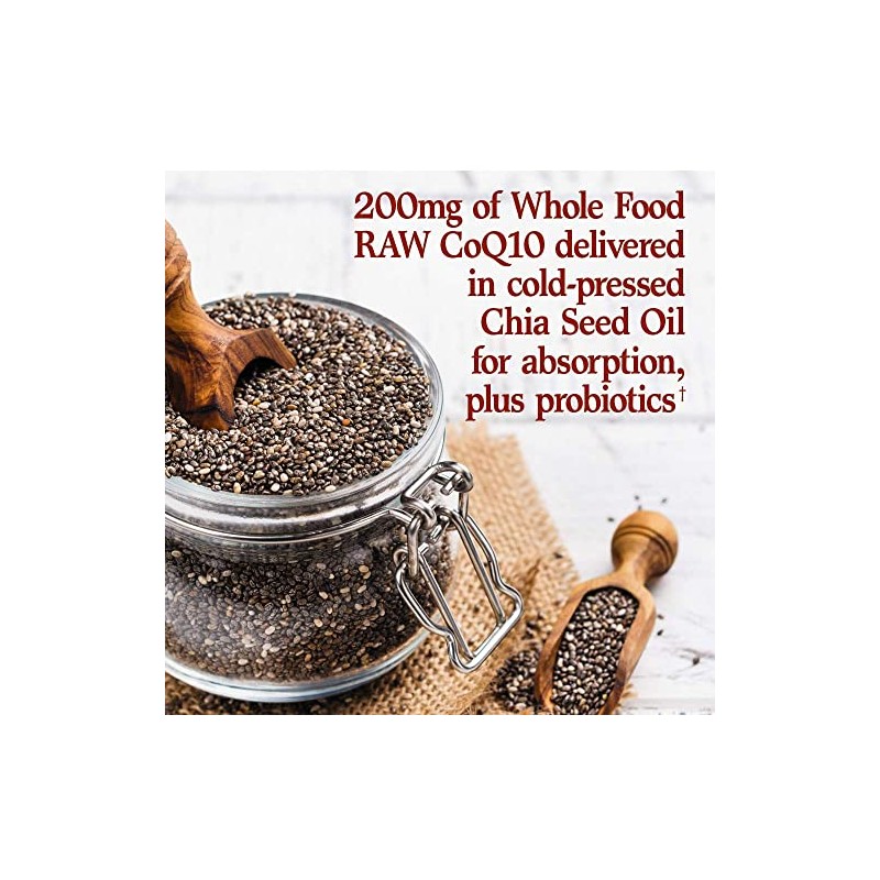- 9 de aceite de semilla de chía crudo prensado en frío) para una alta absorción. La CoQ10 es una coenzima liposoluble, antioxidante y transportadora de electrones que es bien conocida por ser un eficaz eliminador de radicales libres de oxígeno. Cruda significa sin altas temperaturas, aglutinantes sintéticos, rellenos, sabores artificiales, edulcorantes, colorantes o aditivos que se usan comúnmente en los comprimidos. La CoQ10 cruda es un alimento integral mezclado en una base de frutas y verduras cultivadas orgánicamente junto con probióticos. Beneficios de la CoQ10 cruda: