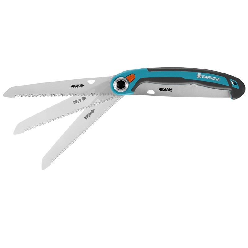 The gardener's folding saw 200 p belongs to the new generation of GARDENA saws. It is ideal for all minor sawing work in the garden, & also for outdoor activities. It is lightweight & effective at the same time. The hard-chrome- plated saw blade has impulse-hardened precision toothing with triple grinding, which ensures fast results with little use of force, & a superb, precise cut. Notching in particular is made substantially easier. Rust has no chance to attack. You can carry this handy folding saw around with you in the garden, for example by safely folding it & locking it securely to put your trouser pocket. Whenever you need your saw, simply open it up again using the thumb hole. The lock button holds the saw securely & safely in three different settings. & if you don't require the saw, simply fold it together again. The saw blade will disappear safely into the beautifully-shaped handle. During sawing, a stop at the end of the handle prevents you from slipping. This has Proven particularly useful during pulling movements, & assists you in making smooth progress. Thanks to the ergonomic, slightly angled handle shape & soft handle parts, this saw lies comfortably & safely in your hand. You can saw one-handed or two-handed as required. The saw can be stored without taking up much room & in a handy place using the eyelet.