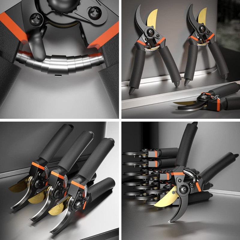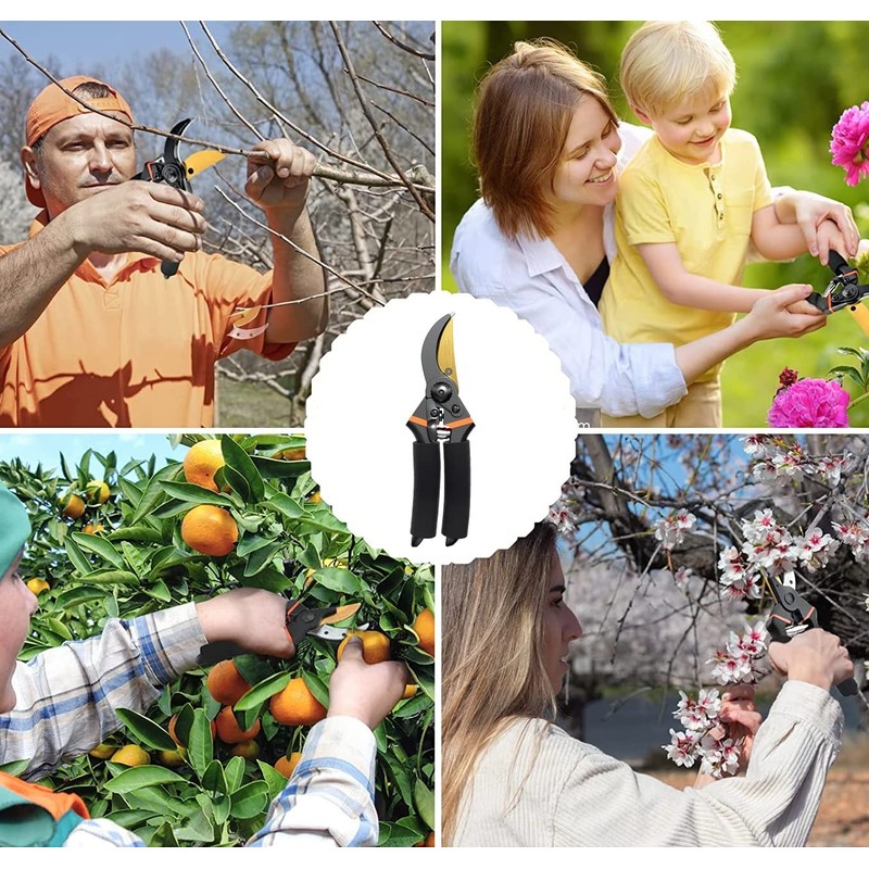 - đăERGONOMIC DESIGNăGarden secateurs are designed for a relaxing and comfort gardening experience.The garden scissors are loaded labor-saving spring and non-slip handles reduces hand fatigue while cutting.