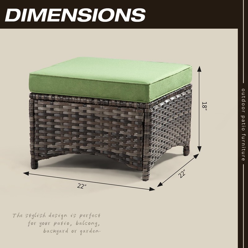 - [Specifications Dimension] Patio Ottoman is 22"W x 22"D x 18"H. Per Maximum Bearing is 250 LBS. Upgraded with more space for foot to rest, ideal match for patio furniture arrangements indoors and outdoors