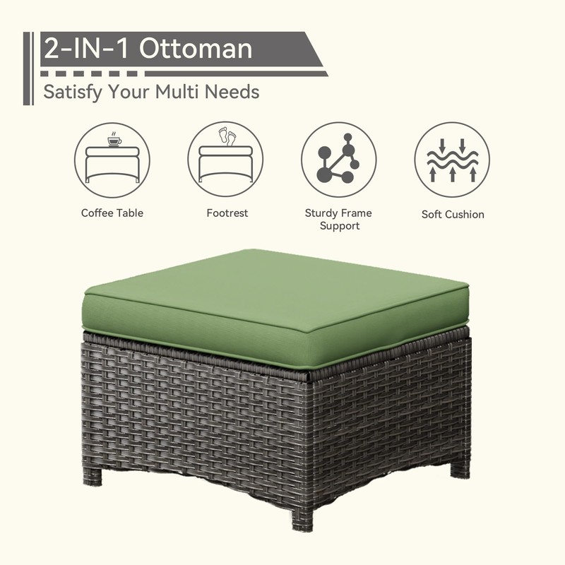 Gardenbee Patio Ottomans Set of 2, 22"x 22"x 18" Outdoor Wicker Footstool with Cushion, Green, for Garden, Backyard, Deck, Porch, Balcony, Poolside